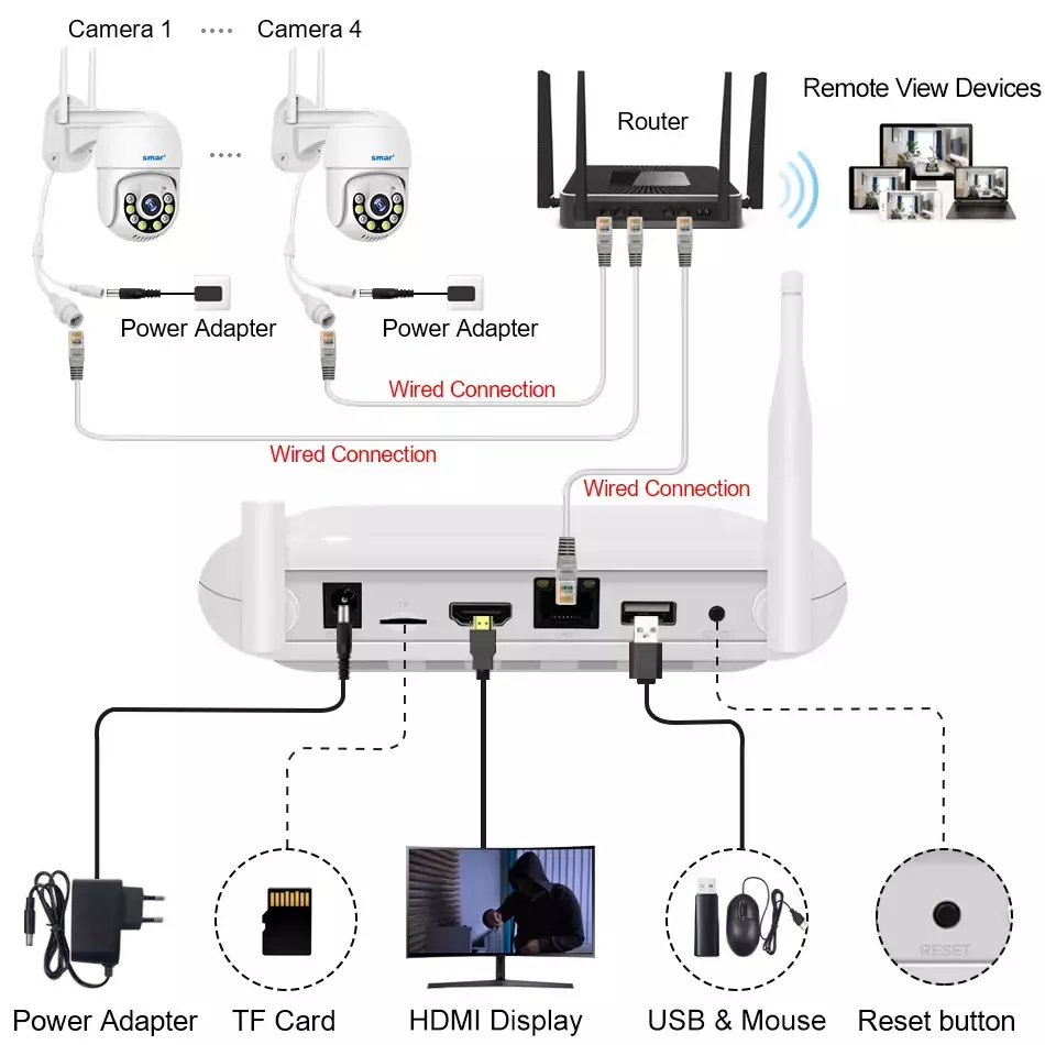 - Conexão sem fio: Suporta câmeras IP Wi-Fi e com fio.