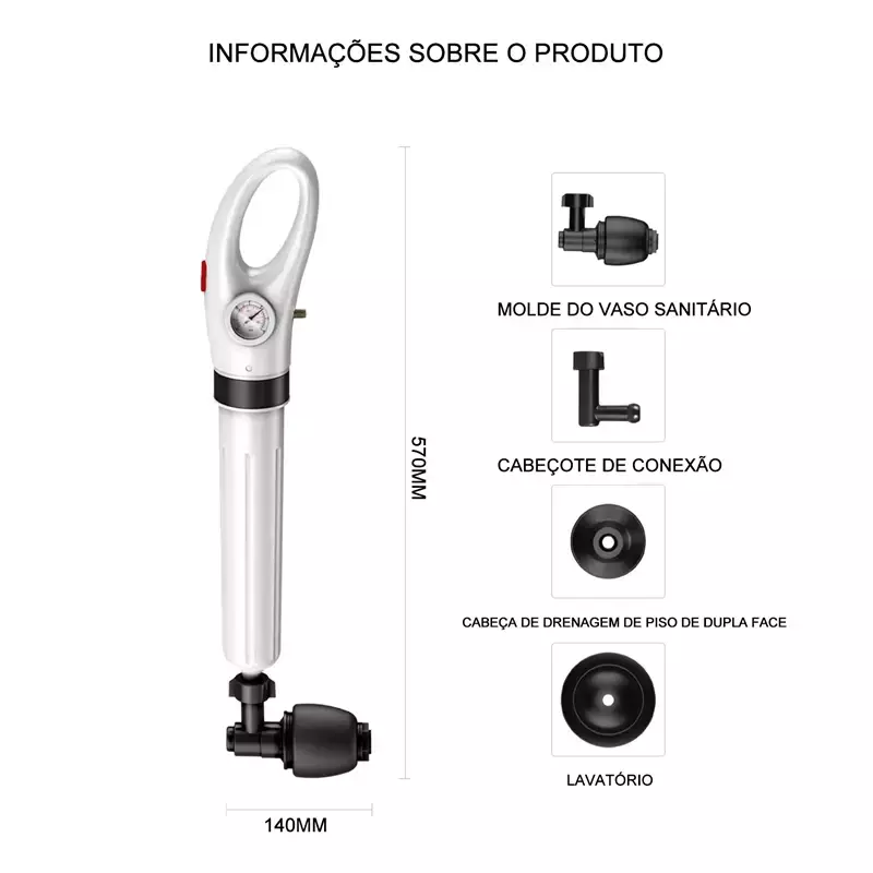 - Uso simples e rápido: basta inflar o airbag com a bomba, posicionar o cabeçote no cano e pressionar o botão para resolver o entupimento rapidamente.